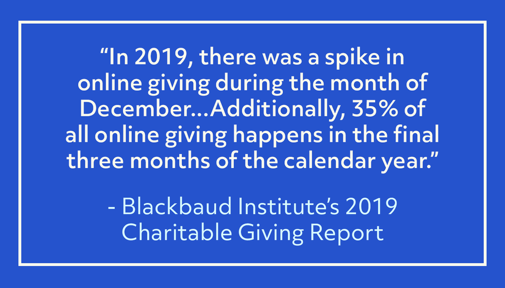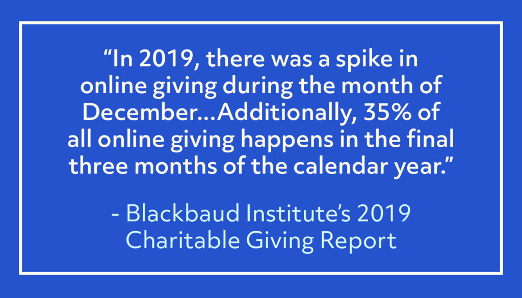 There’s no denying that year-end giving plays a huge part in any nonprofit’s online fundraising strategy. According to the Blackbaud Institute’s 2019 Charitable Giving Report, almost 20% of all 2019 online giving happened during the month of December.
