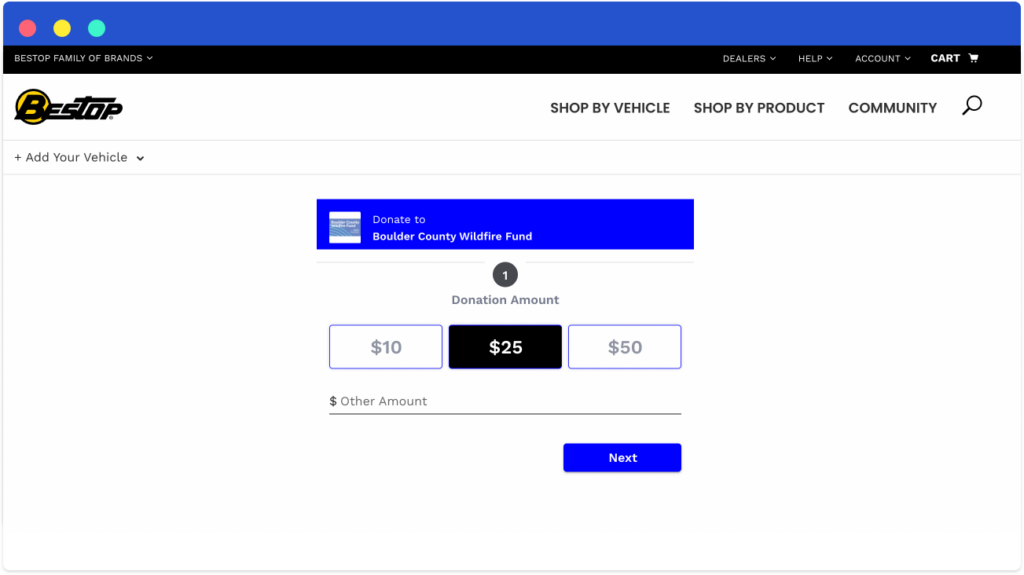 Bestop has a long history of innovation and a loyal customer base that proves it. Located in Louisville, Colorado, they employ around 500 people who work to create premium soft tops and other accessories for vehicles like Jeep and Wrangler. We were thrilled to partner with them on custom donation options for their eCommerce website.
