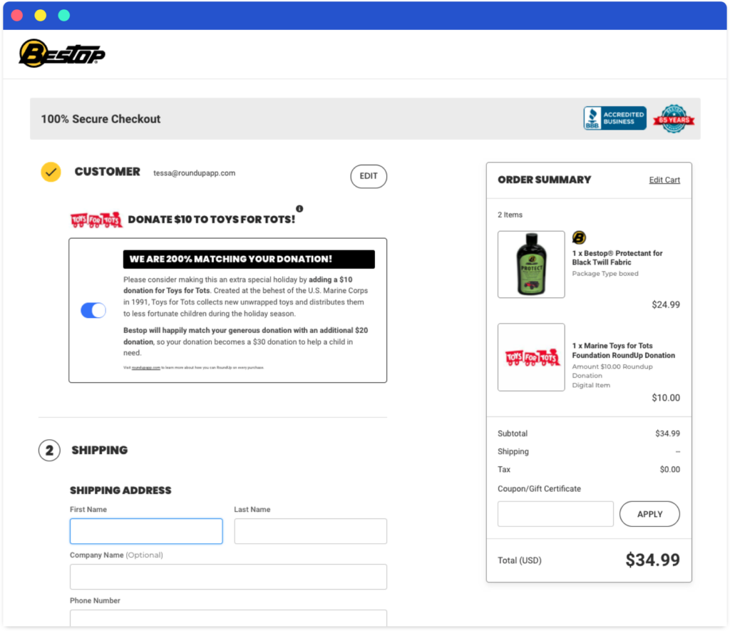 Bestop wanted to include their online customers in the fundraiser and give them an option to “round up” in full dollars, rather than just cents.
