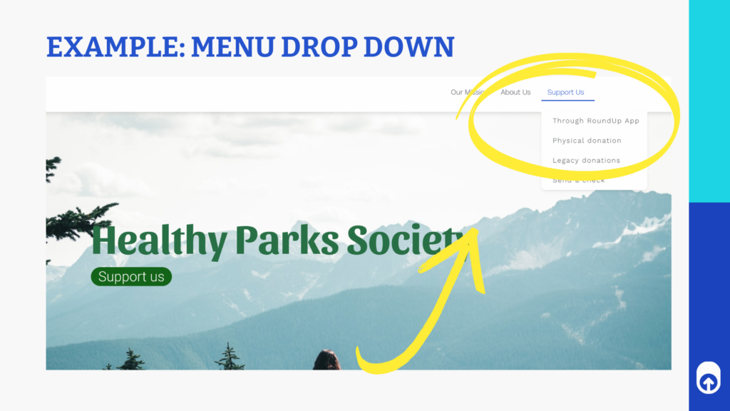 There are many different ways you can include links to your RoundUp App profile in your header. You can include a direct link like “RoundUp for change,” a custom donate button, or include us in the drop-down options of your menu!