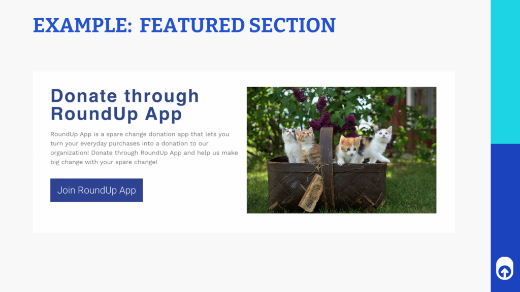 These types of sections are a great way to connect your audience to crucial pieces of information or to direct them immediately to your RoundUp App profile. One way to highlight RoundUp App is to create a new featured section dedicated solely to the RoundUp method of donating.