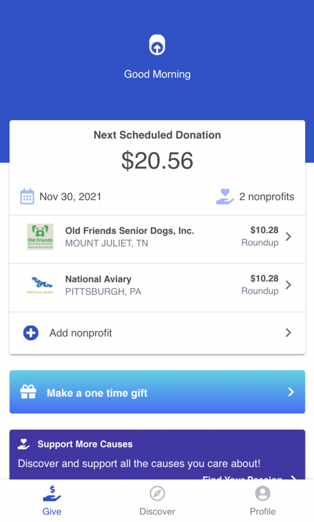 Nonprofits rely on all types of donors to achieve their goals. Whether they’re monthly donors, RoundUp donors, or giving one-time gifts, we’ve made it easier for donors to give. Donors have full control over their donations, allowing them to set up recurring monthly donations, RoundUp donations, or one-time gifts to multiple nonprofits.