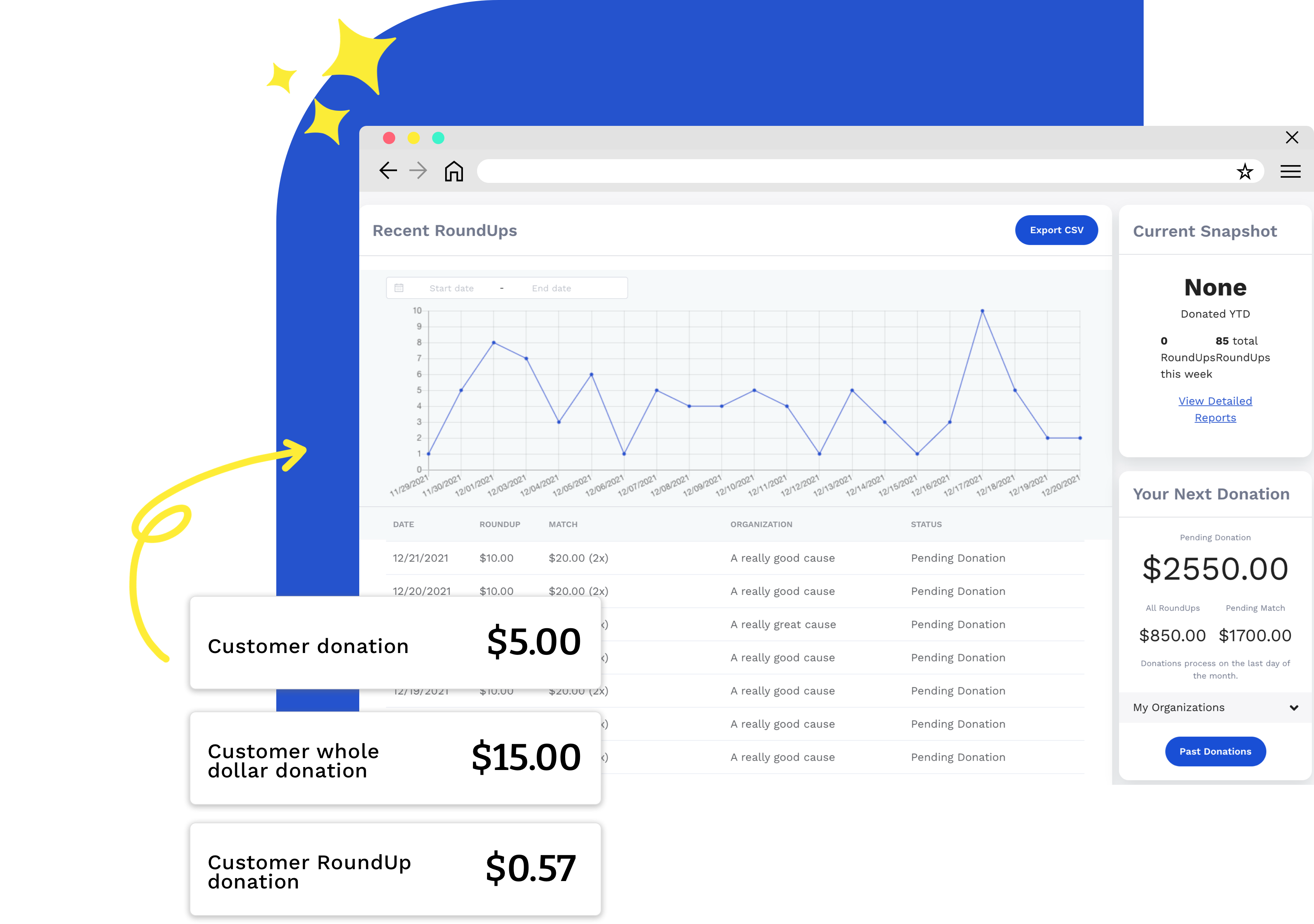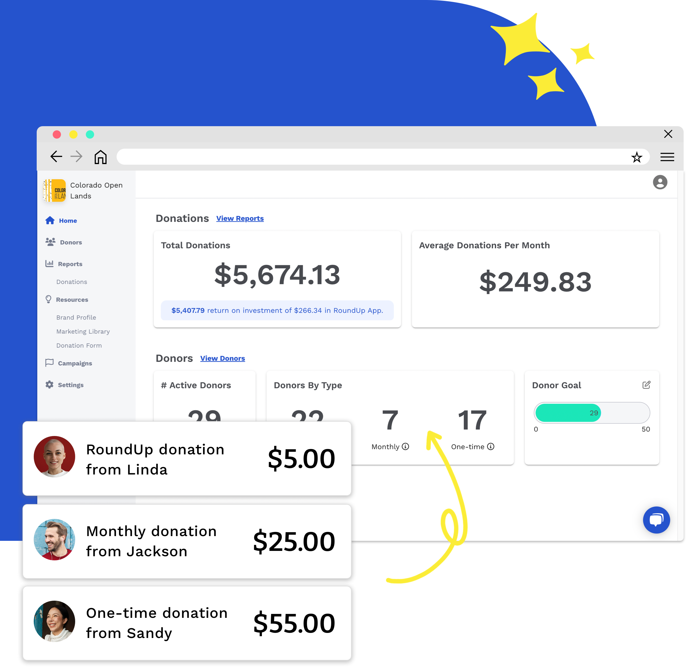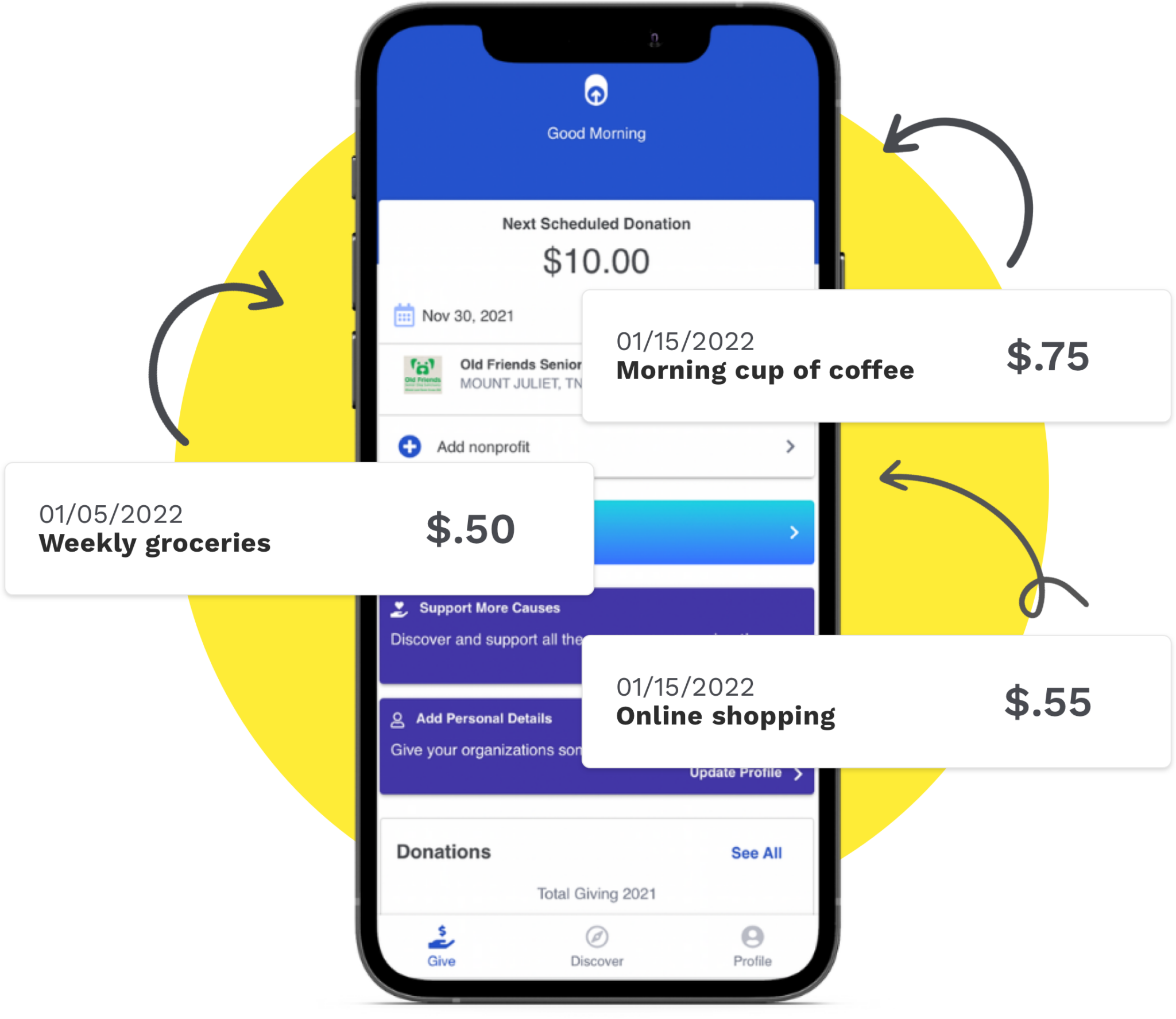 With our donation platform, nonprofits can easily fundraise through RoundUp donations, monthly donations, or one-time donations. Track donations, report on donor data, and build campaigns, all while connecting and engaging your donors.